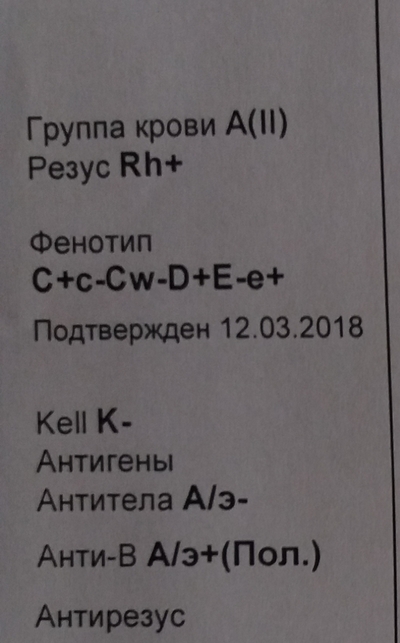 В карточке своей вычитала, что у меня следующий тип крови: O(I) DссEEkk. Т.е. из перечисленных антигенов у меня обнаружены только антигены D, с, E и k:
